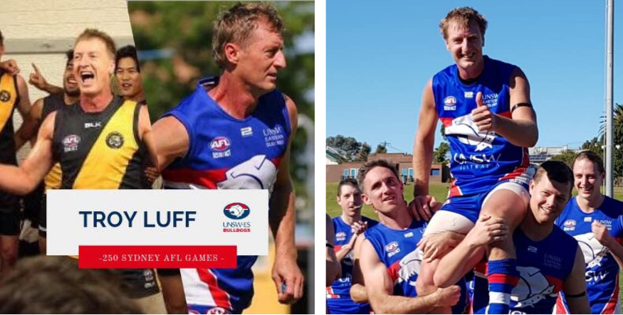 Our Round Eight winner Troy Luff was at it again on the weekend kicking 11 straight goals and assisting on another four in his 250th game of AFL Sydney football. Luffy seems to be getting better with age as this was his second 10-plus goal performance in three weeks. Something he had not managed for ten years prior to his Round 8 performance. Congratulations Luffy!