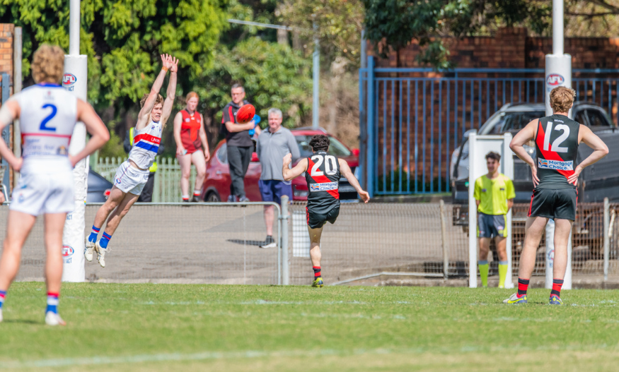 A low kick out of defence opened up the centre corridor for the Bulldogs. Kilpatrick looked for Emery with a sweeping handball. He was surrounded quickly by a pair of North Shore defenders. The ball was flicked out to Burgess Hoar. From 20 metres out, almost directly in front, Charlie finished across his body.