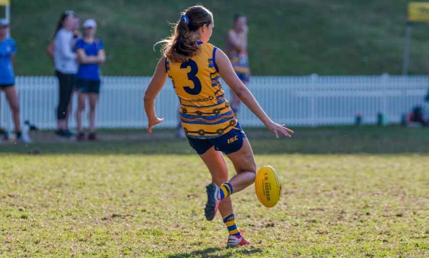 Plummer is everywhere for the Goannas early, diving into contests and feeding the ball out with skill and speed. Her efforts keep the ball locked safely in Macquarie’s forward line forcing massive pressure on the Students defence. The Macquarie mids can smell an opportunity, bullocking through the contest and finding Fletcher lurking out the back waiting for her moment. They feed her a rapid-fire handball, she turns on a dime and launches a towering long bomb from behind the contest through for the first major of the day.