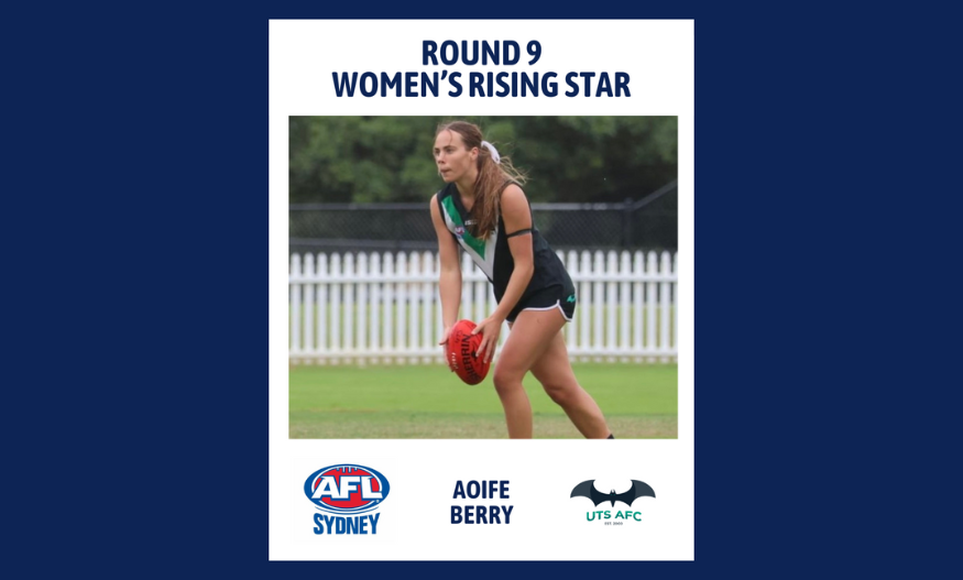 “Aoife took on some of AFL Sydney’s best Centres in Parramatta on the weekend, and played a pivotal role in winning centre clearances. Going head to head at points, with former GWS Giants captain Amanda Farrugia, she took on the challenge with such a high poise and maintained her ball winning ability.” – UTS Bats Women’s Premier Division Coach, Daniel Fiedler