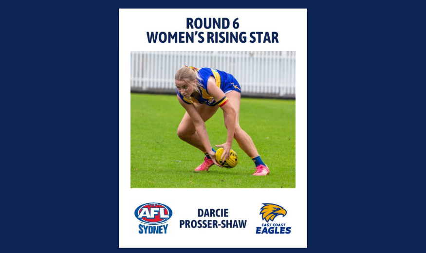 Player Profile Name: Darcie Prosser-Shaw Nickname: Darce AFL Sydney Club: East Coast Eagles Position: Half Back What is one thing that we don’t know about this Rising Star that they are well known for around the club? She is the…